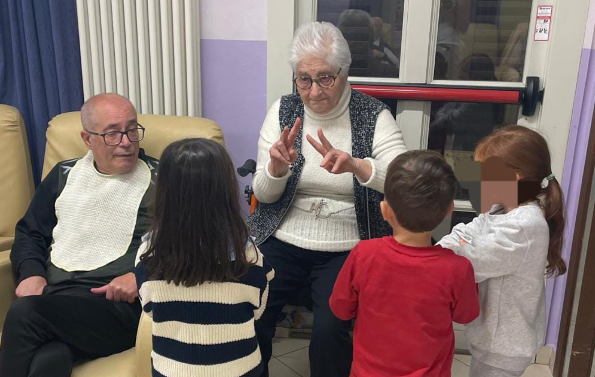 Gli ospiti ci hanno donato dei cuoricini all’uncinetto fatti a mano, un simbolo prezioso del loro affetto e della loro cura. In cambio, noi abbiamo portato un grande cartellone con le impronte dei bambini, che rappresenta la strada percorsa per arrivare da loro, come un simbolo visivo del nostro cammino verso la connessione con la comunità.